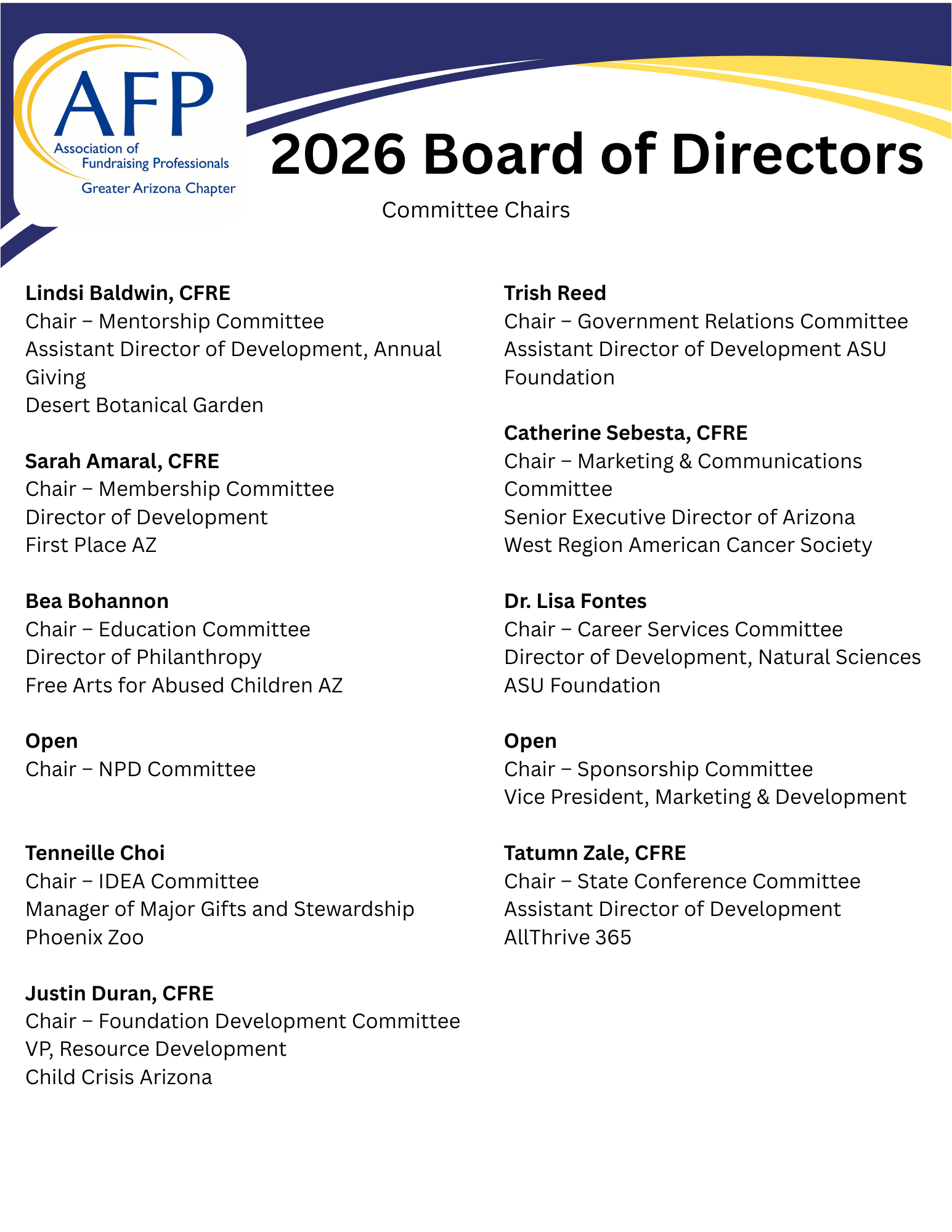 Karolyn Kiburz, CMPAssociation AdministratorMeetings & Concierges Source LLC4300 N. Miller Rd. #141Scottsdale, AZ 85251T: (480) 947-3459 or (480) 990-1887F: (480) 990-1889admin@afpaz.org