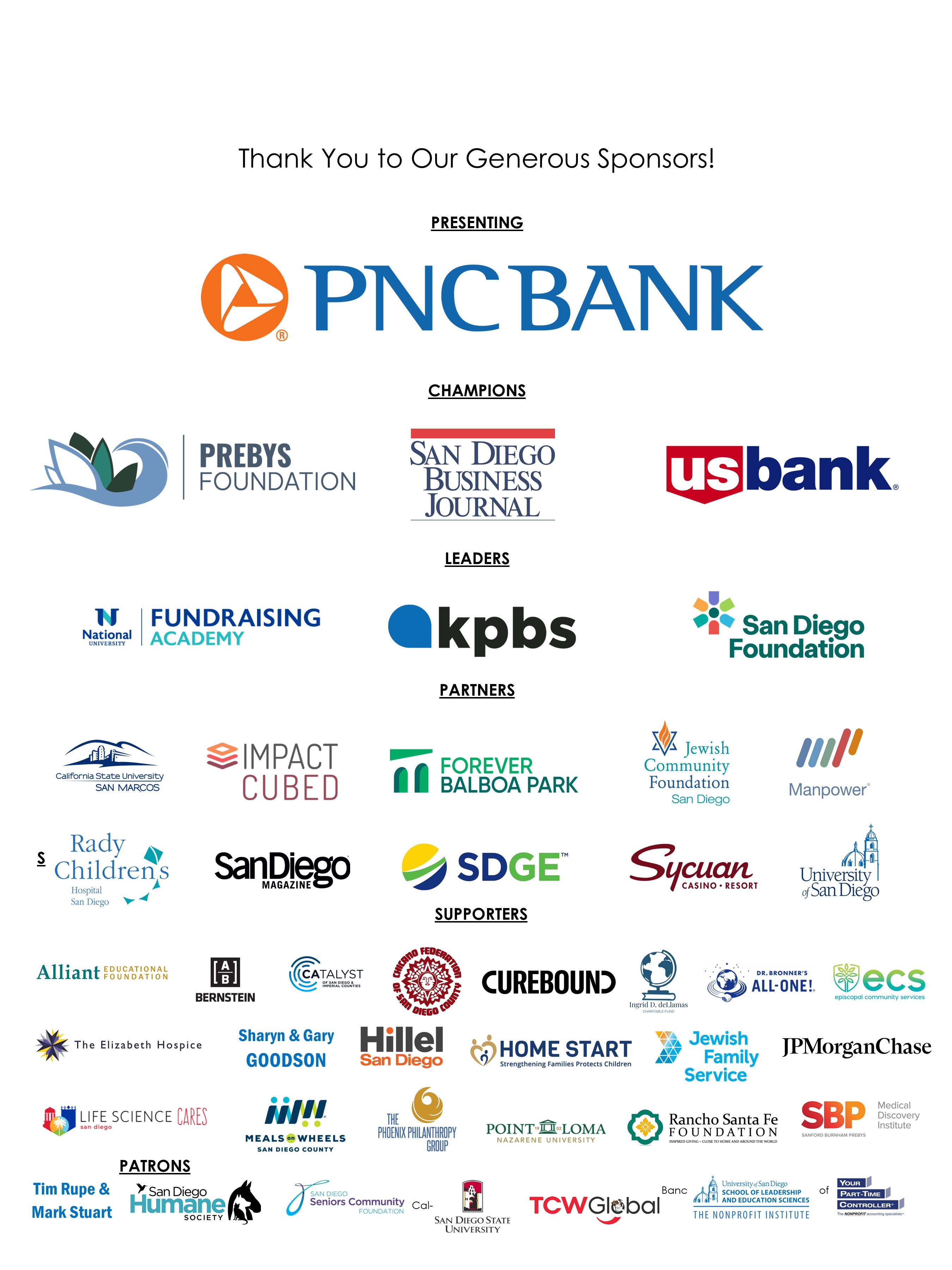 National Philanthropy Day (NPD) is not just an extraordinary gathering to honor outstanding individuals and organizations; it is an opportunity to celebrate and share the power and impact of philanthropy in San Diego. This year’s program, with PNC Bank as our Presenting Sponsor, will celebrate the people who contribute time, talent and treasure, and how they positively impact our lives.