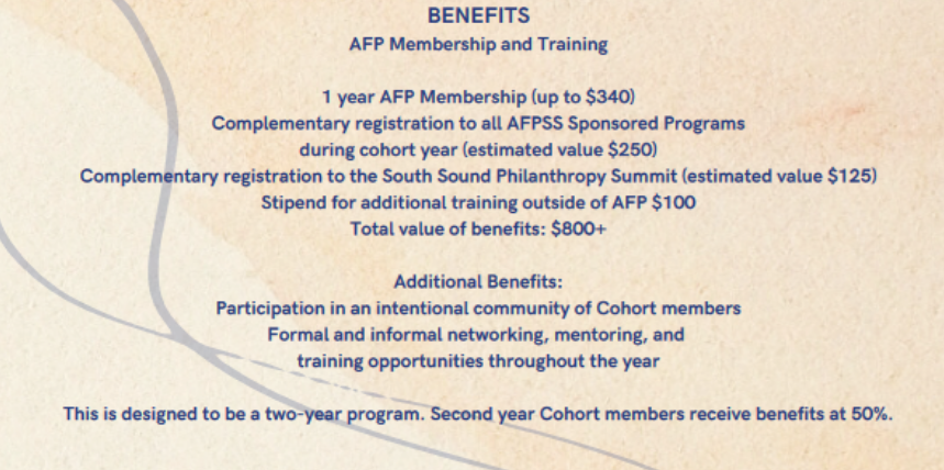 The 2026 Cohort will serve up to 6 people. First year members receive an AFP membership and access to all AFP South Sound programs at no cost, in addition to other benefits, outlined below.